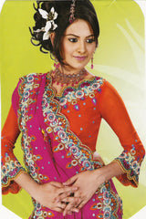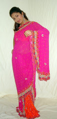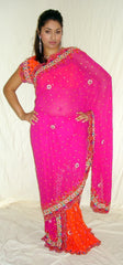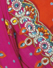 Breathtaking Rani Pink and Orange pure georgette saree. Fine quality embroidery of cutwork, stones, sequins and kundan on all borders of saree and pallu. Comes with a matching orange colour unstitched blouse in crepe material. Be the talk of the party with this stunning outfit on!