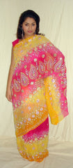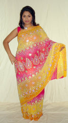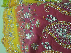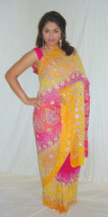 Immerse yourself into this fabulous designer style saree and look fabulous. This saree is made of semi pure georgette material embroidered fully with sequins, silver gota patti and stones. Comes with an unstitched blouse with same colours and embroidery on sleeves and back of blouse. Please inquire about other colour combinations.